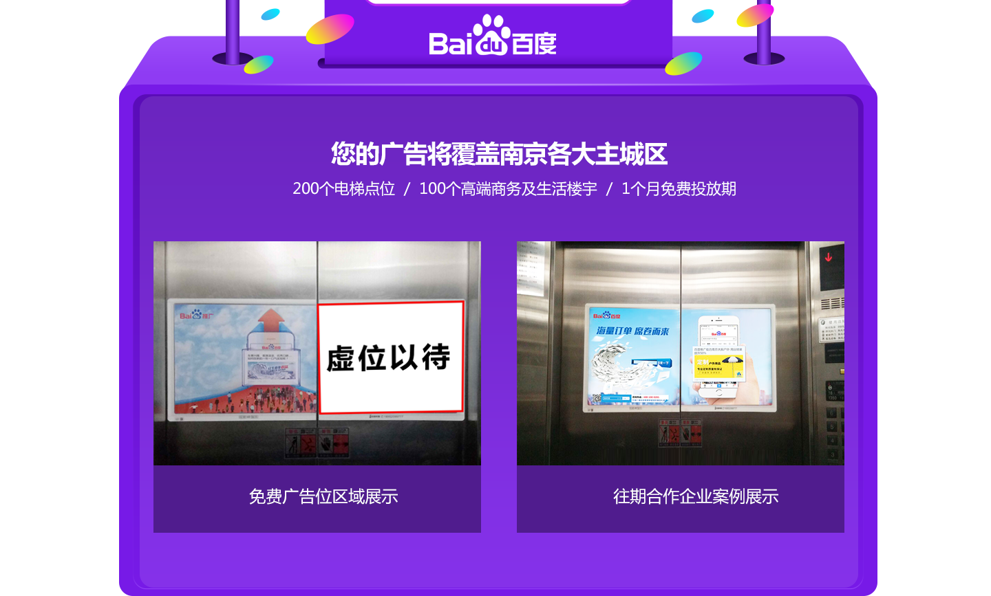 1、2018年11月12日—2018年11月30日期间参与本次活动,完成百度产品开户,即有机会获赠电梯广告位!先到先得!